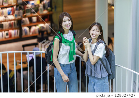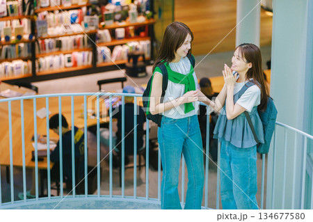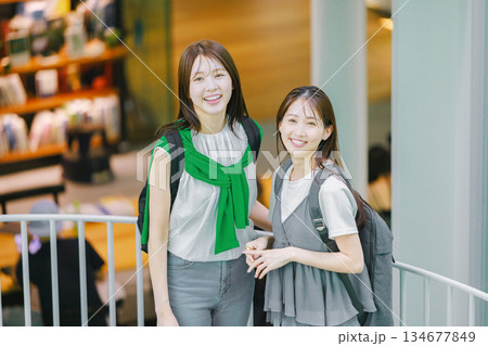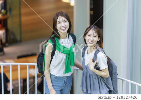 一名女大學生與朋友一起爬校園樓梯