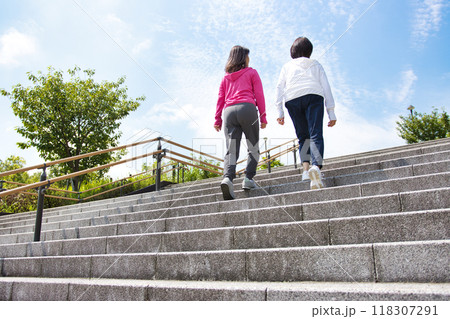 兩名穿著運動服行走的中年婦女的後視圖