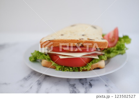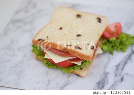 A delicious sandwich with layers of fresh ingredients like lettuce, tomato, cheese, and deli meats, all stacked between two slices of soft bread. Perfect for a quick and satisfying meal.