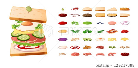 Sandwich constructor. Different tasty snack ingredients, sliced vegetables, egg, bacon, fresh greens and cheese between toasts, menu assortment cartoon flat style isolated tidy vector set