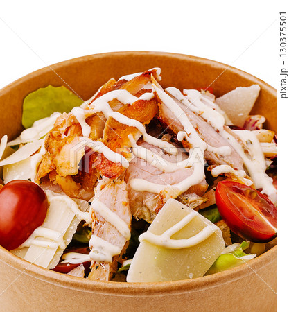 Fresh chicken salad with cherry tomatoes and creamy dressing served in a bowl