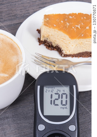 Glucometer using for sugar level control, portion of sweet cheesecake and cup of coffee
