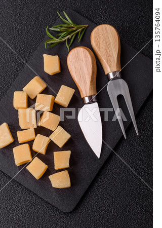 hard ripe cheese grated into small pieces for cooking pasta or pizza, grated piece of yellow cheese as an ingredient for a large dish