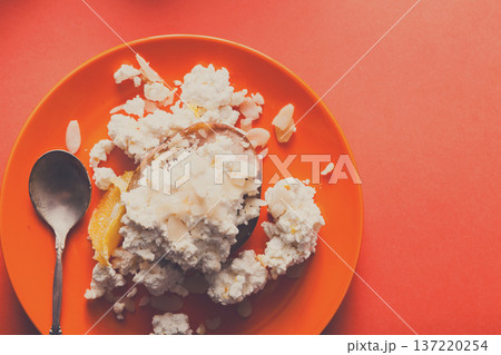 Healthy breakfast, dieting and detox concept - fresh cottage cheese on plate on bright orange background. Still life, flat lay, top view, copy space