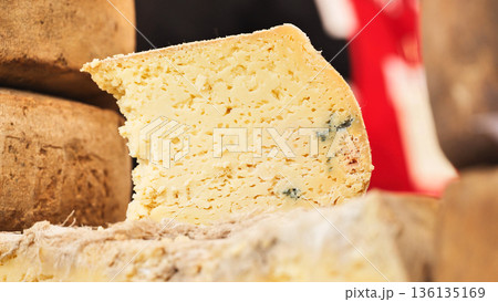Farmer cheese on a market stall, huge wheels of different types of cheese.