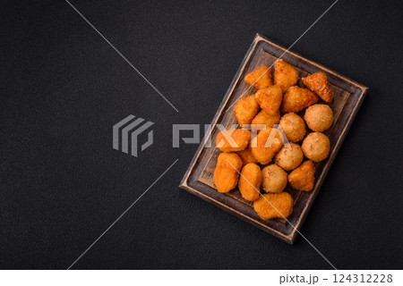 Fast food brie fries, cheese balls and chicken nuggets