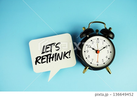 Let's Rethink! text on speech bubble with alarm clock on blue background