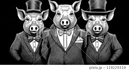 來自邪惡組織的擬人豬角色的黑白插圖,黑色背景