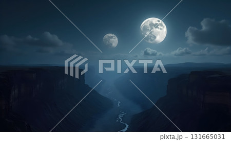Two Bright Moons Rising Above Alien Canyon In A Surreal Planetary Sky