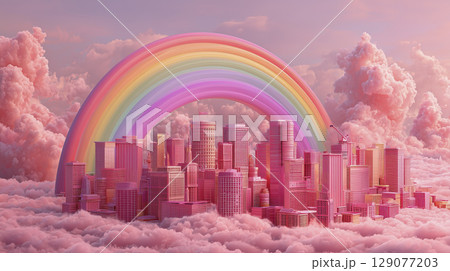 Vibrant cityscape with tall buildings surrounded by pink clouds and colorful rainbow arching over skyline, creating dreamy and whimsical atmosphere