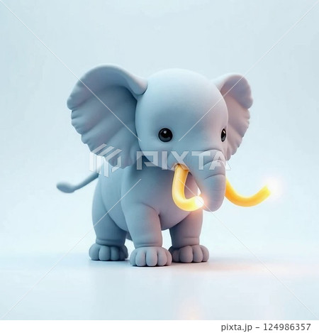 A tiny elephant with balloon feet and glowing tusks floating in front of a white background, surreal cute fantasy animal