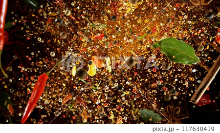 Freeze Motion Shot of Flying Mix Spices . Isolated on Black Background