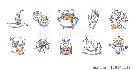 Set of Halloween elements and hand drawn icons includes a witch hat, eyeball, cauldron, hand with eyeball, spooky tree, skulls, spiderweb, potion bottle, crystal ball, pumpkin head scarecrow . Vector
