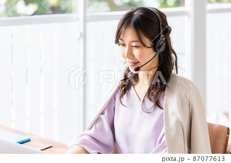 一位戴著耳機在室內工作的女商人