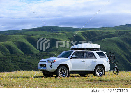 Offroad car carrying bikes on flowering grassland mountain under blue sky