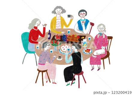 婦女圍著桌子吃飯的手繪插圖