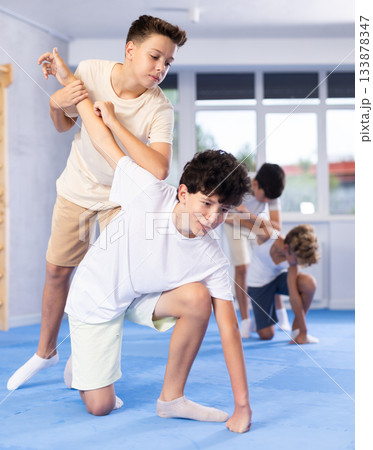 Boy doing throw over shoulder at self-defense lesson in sport gym