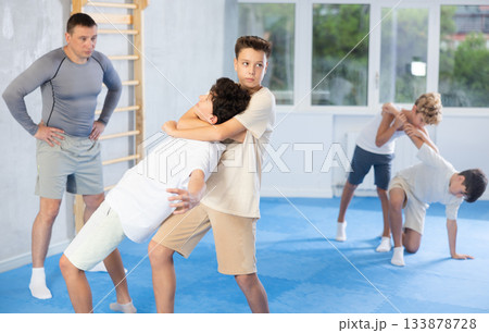 Teens learn doing throw over shoulder in self-defense lesson in sport gym