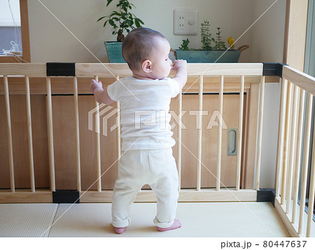 一個抓住並站在嬰兒圍欄中的半嬰兒