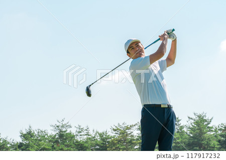 一名男性高爾夫球手在高爾夫球場打高爾夫球(嚴肅、開球、高爾夫比賽)