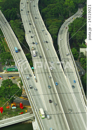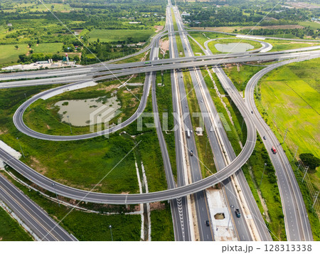 Drone shot a large highway interchange crossing over green farmlands in Thailand