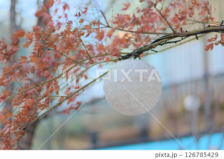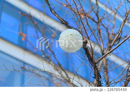 街道樹木上裝飾的冬季照明球