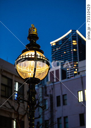 日本橫濱馬路的橫濱都市風景。關內大廳前的圓形煤氣燈