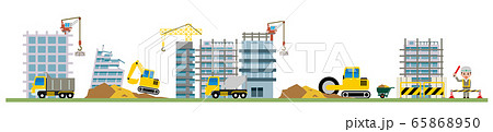在建築工地工作的人們。很多材料。建築工地和重型設備挖掘機車。建築工程。