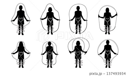 Black Solid Heart Health Skipping Silhouettes Set of Six on White Background