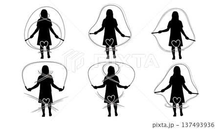 Black Solid Jump Rope Skipping Silhouettes Set of Six on White Background