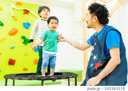 [相模原市麻溝公園兒童遊樂場,一歲小孩和媽媽在彈跳床上玩耍]