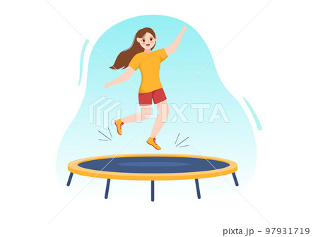 Vector Illustration of a Little Boy or Girl Jumping on a Trampoline, Enjoying Summer Outdoor Activities with a Flat Style Cartoon Background