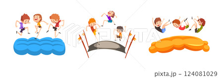Happy Kids Jumping on Trampoline Bouncing and Having Fun Vector Set