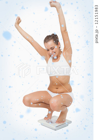 Profile of athletic woman doing squat, lower body sport exercise, warming up and training muscles, wearing black sports top and tights. Full length studio shot illuminated by sunlight from window.