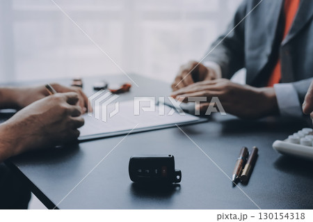 Car salesman gave the keys to the customers who signed the purchase contract legally, Successful completion of car sales, Purchase contract and key delivery.