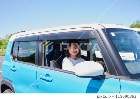 車內照片:一名男司機微笑著調整汽車後視鏡