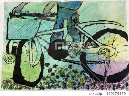 Woman is riding bicycle on the ice. Tires on bike are covered wi