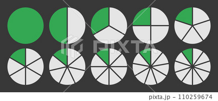 Circle divided into 1-10 parts icon set. Full circle segment diagram in 1-10 parts graph icon pie shape section chart in green and white color. Circle divided in ten parts infographics.