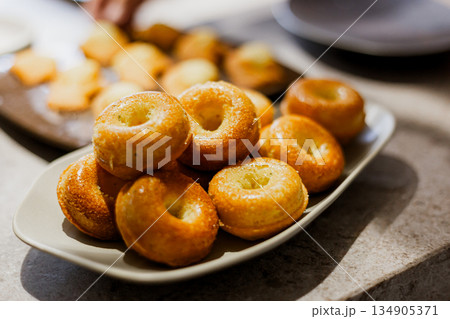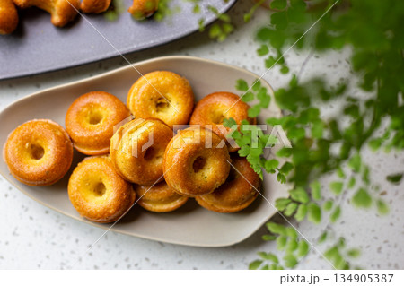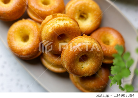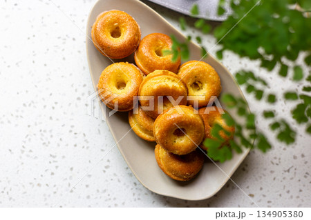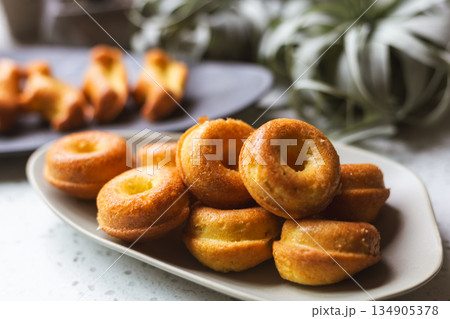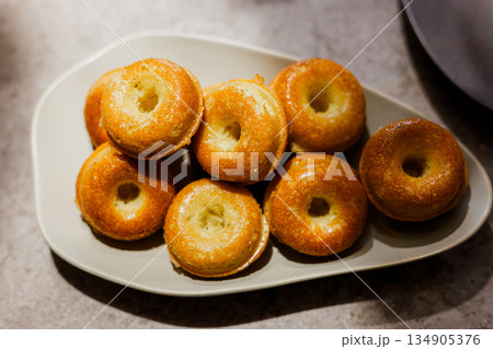 橢圓盤上的金黃迷你甜甜圈造型磅蛋糕