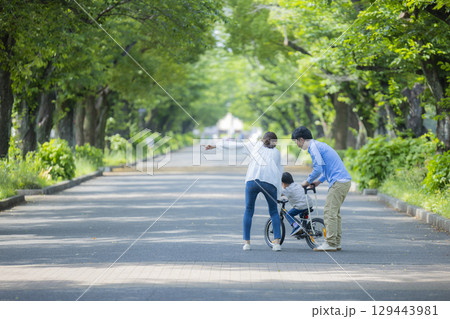 父母和孩子練習騎自行車