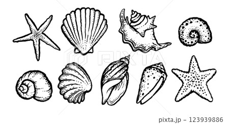 Sea shells and starfish monochrome set. Ink black hand drawn vector illustration on white background.
