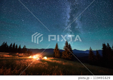 Silhouettes of tourists resting at campsite around campfire with glowing tents nearby under starry sky. Milky Way stretches above, casting serene and magical light over tranquil mountain landscape.