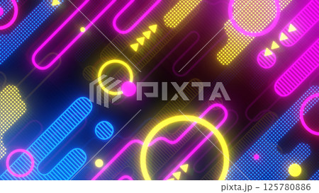 大圓圈上有孟菲斯風格的形狀和圖案的流行作品 - 霓虹色