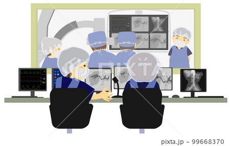 Spinal surgery. Group of surgeons in operating room with surgery equipment.