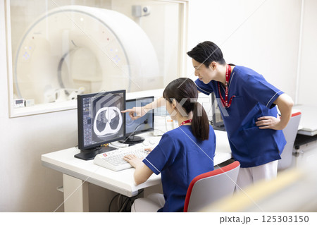 放射科醫生在顯示器上查看 CT 掃描結果。照片由東京電子專門學校電波學園提供。
