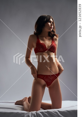 Slim woman in red lace lingerie standing on her knees in bed