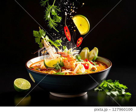 AI generated tangy thai sour curry with fresh vegetables and aromatic spices falling into ornate thai bowl vibrant tamarind broth healthy herbs authentic asian comfort food