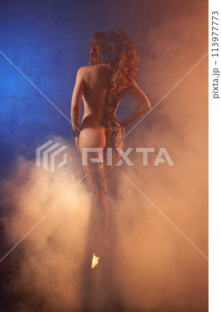 Anonymous naked woman in body art with horns on her head in smoke