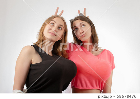 nice portrait of two beautiful young woman in black witch halloween costumes on party over white background.