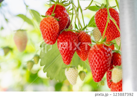 日本溫室草莓栽培。採摘草莓體驗。 草莓掛在樹上